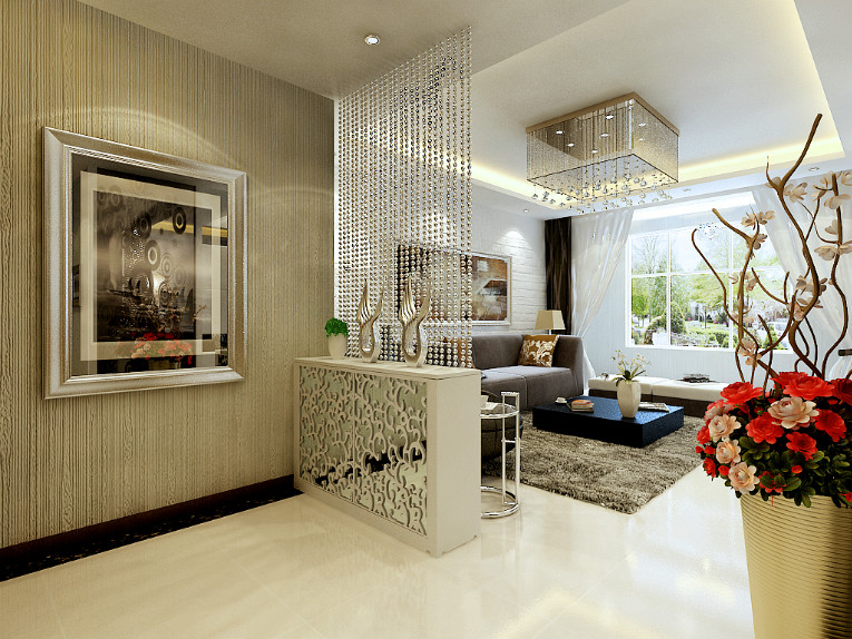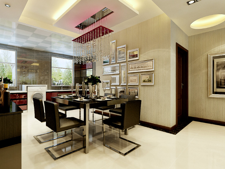 餐廳空間的硬裝上,為了體現業主追求現代主義的個人風格,餐廳的色彩運用比較低調。米黃的豎紋壁紙,黑色的餐邊柜,黑色金屬質感的餐桌和餐椅,華麗時尚的水晶吊燈與餐桌上的器皿呼應。這種色彩組合的呼應能使空間的色彩搭配更具有統一性。