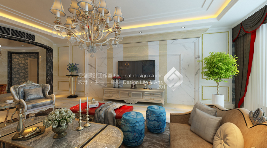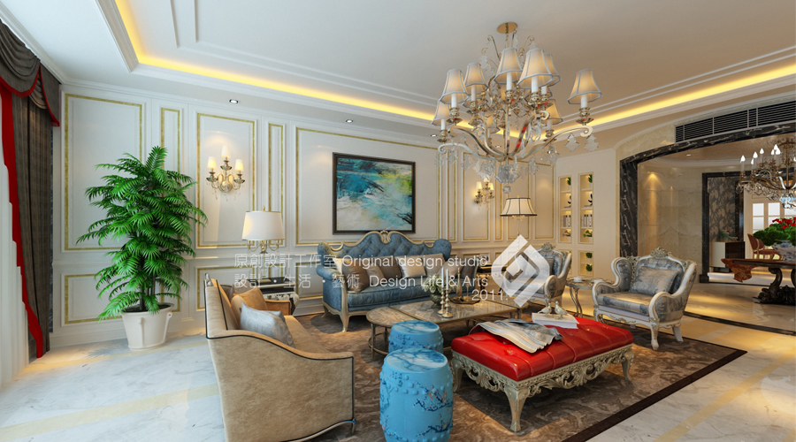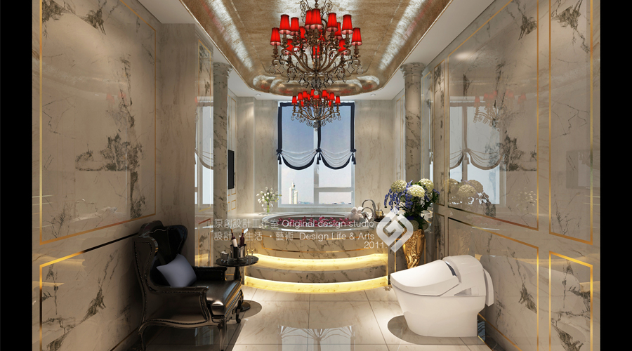 本案客廳墻面采用米白色啞光護墻板,細節(jié)處描金。護墻板的造型并不復雜,采用直線造型,摒棄繁瑣,使得整個空間,時尚現(xiàn)代的同時,又透露著低調的奢華。客廳吊頂部分設計為懸浮+疊及,摒棄了復雜的線條,時尚、輕松卻又不失業(yè)主的高貴氣質。衛(wèi)生間整體用大理石進行鋪設,細節(jié)處描金,紅色的吊燈點綴,更加凸顯衛(wèi)生間奢華與時尚。兒童房白底黑花紋壁紙并與掛畫相互映襯,大方卻不失活潑