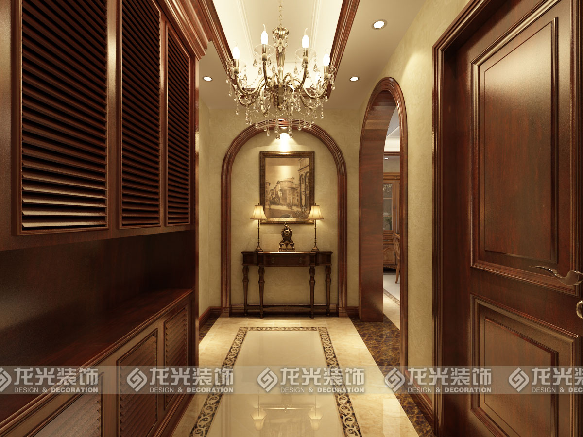 1進(jìn)門采用玄關(guān)式設(shè)計,用頂面造型和地面造型增加過廊的體量感,進(jìn)戶門左面的鞋衣柜更為實用,在柜體中間還可以擺放手機(jī)鑰匙等。