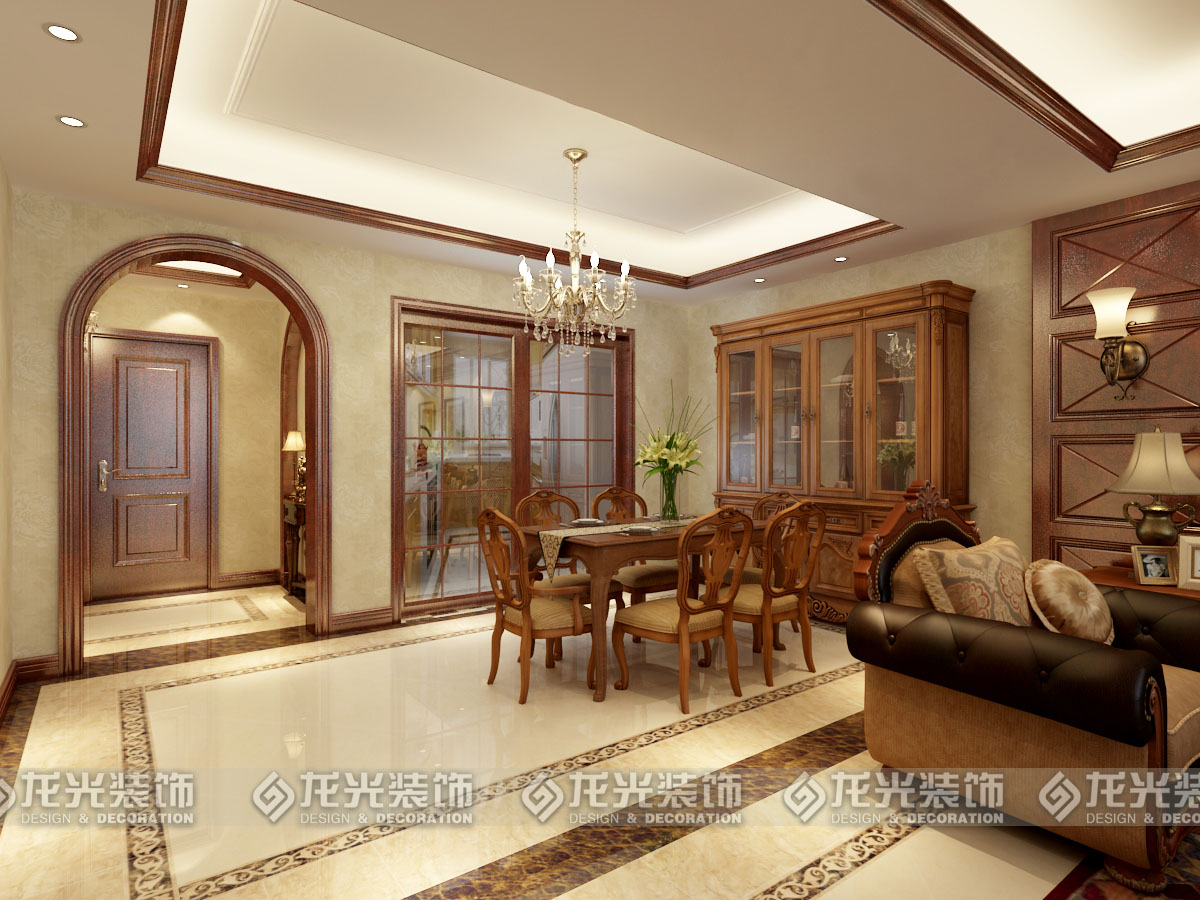 4餐廳區(qū)域地面地線和吊頂?shù)哪揪€是相呼應(yīng)的,從地面和頂面劃分出餐廳與客廳之間的分區(qū)。