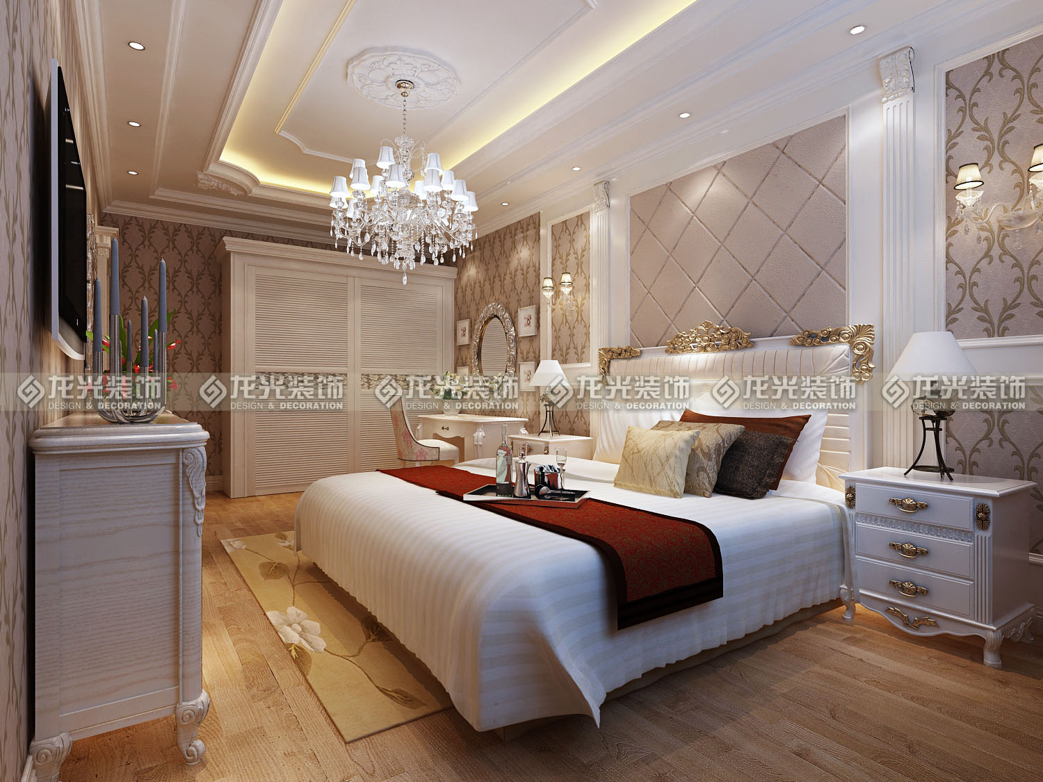 4、主臥室吊頂采用多重疊級式吊頂,多層大小不同的石膏線體現了歐式元素,使比較大的棚面變得更加精致,細膩,床頭背景是用護墻板,壁紙和軟包材質相結合,使得背景墻做出來更加顯得大氣美觀。
